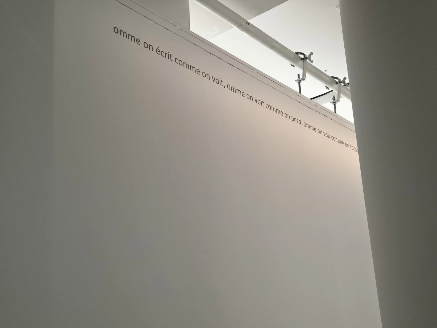Travaillant à conjoindre le voir et le lire par leur dispositif spatial (hauteur et longueur du texte sur les cimaises près du plafond) via le corps du public (amené à se déplacer dans la galerie pour ‘poursuivre’ sa lecture), les Frises veulent faire entendre un sens qui vole de ses propres ailes et s’affranchit des logiques habituelles.