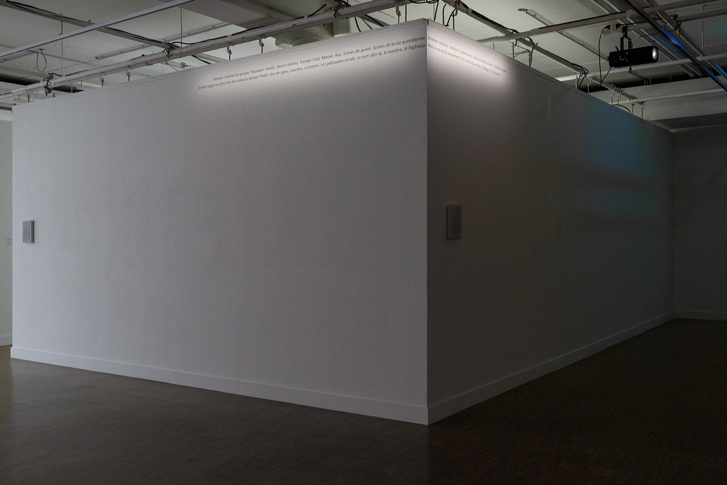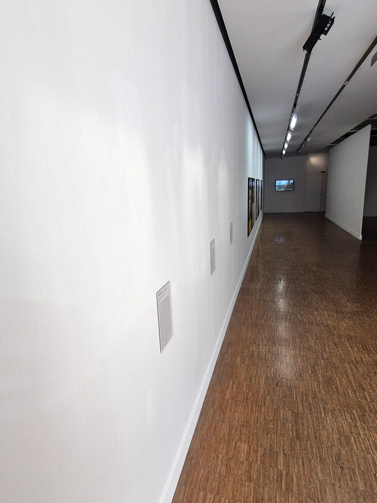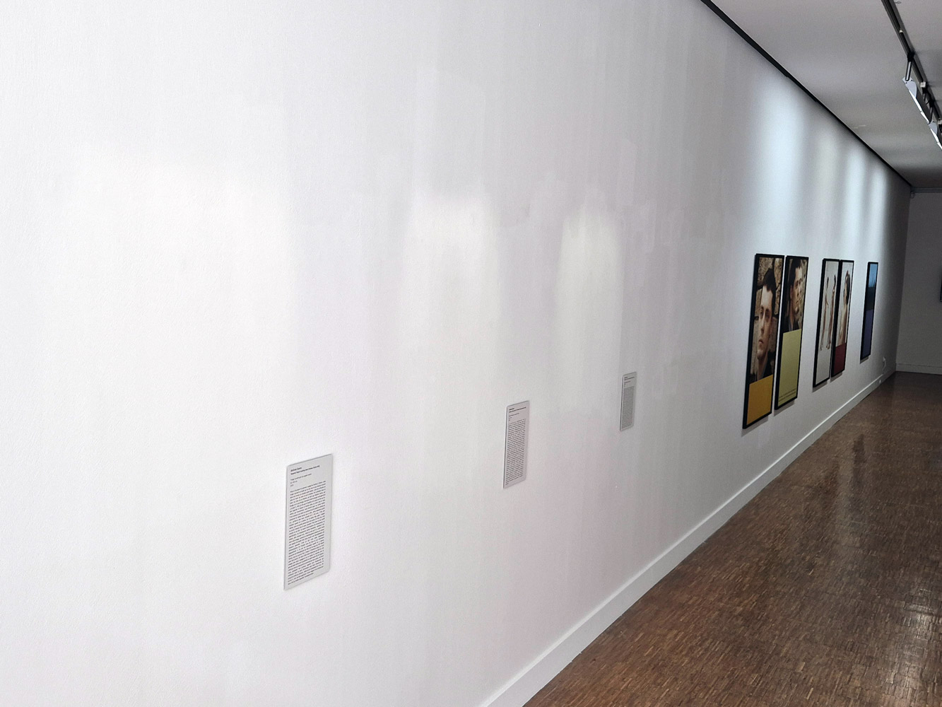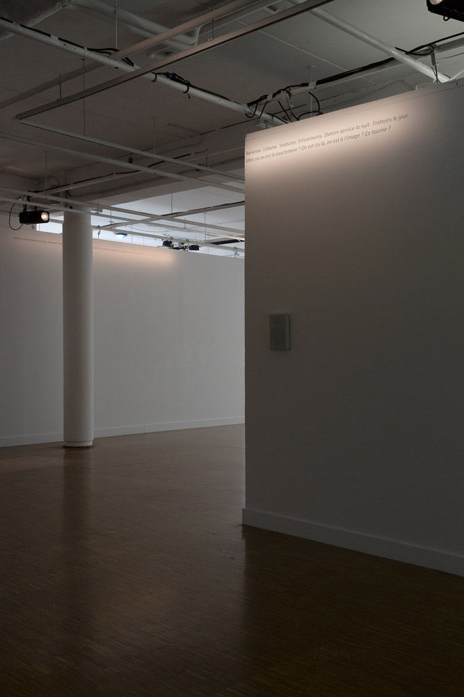 Dans les Cartels, c’est le dispositif expographique et son discours qu’on s’approprie pour la distance qu’ils permettent de créer entre, d’une part, ce qui est dit de ce qui est montré, et d’autre part, cela même qui est montré : à côté d’une ostensible absence d’œuvre au mur (de photographie, pour être plus précis), un texte, tel un ‘vrai’ cartel, commence par en remplir la fonction usuelle (fournir au public des éléments techniques, biographiques, ‘hématiques etc., sur un expôt et son auteur). Mais très vite, il fait cela de manière digressive, comme en biais. Un peu comme un à côté de qui créerait un à la place de, mais incertain, étrangement im/précis.