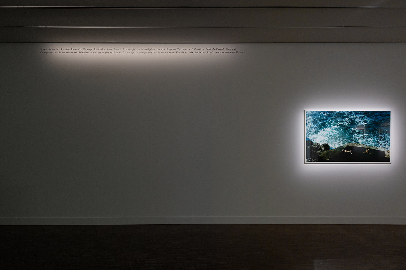 Faire percevoir des personnages, du décor, du regard (des regards), simultanément abstraits et concrets — suffisamment en tout cas, pour servir de surface de projection ‘oétique à un public en train de déambuler dans l’espace d’exposition — et précis aussi, pour stimuler ses dés/identifications imaginaires en lien avec ce qu’il voit alentour : c’est l’ambition de ces Audioguides.